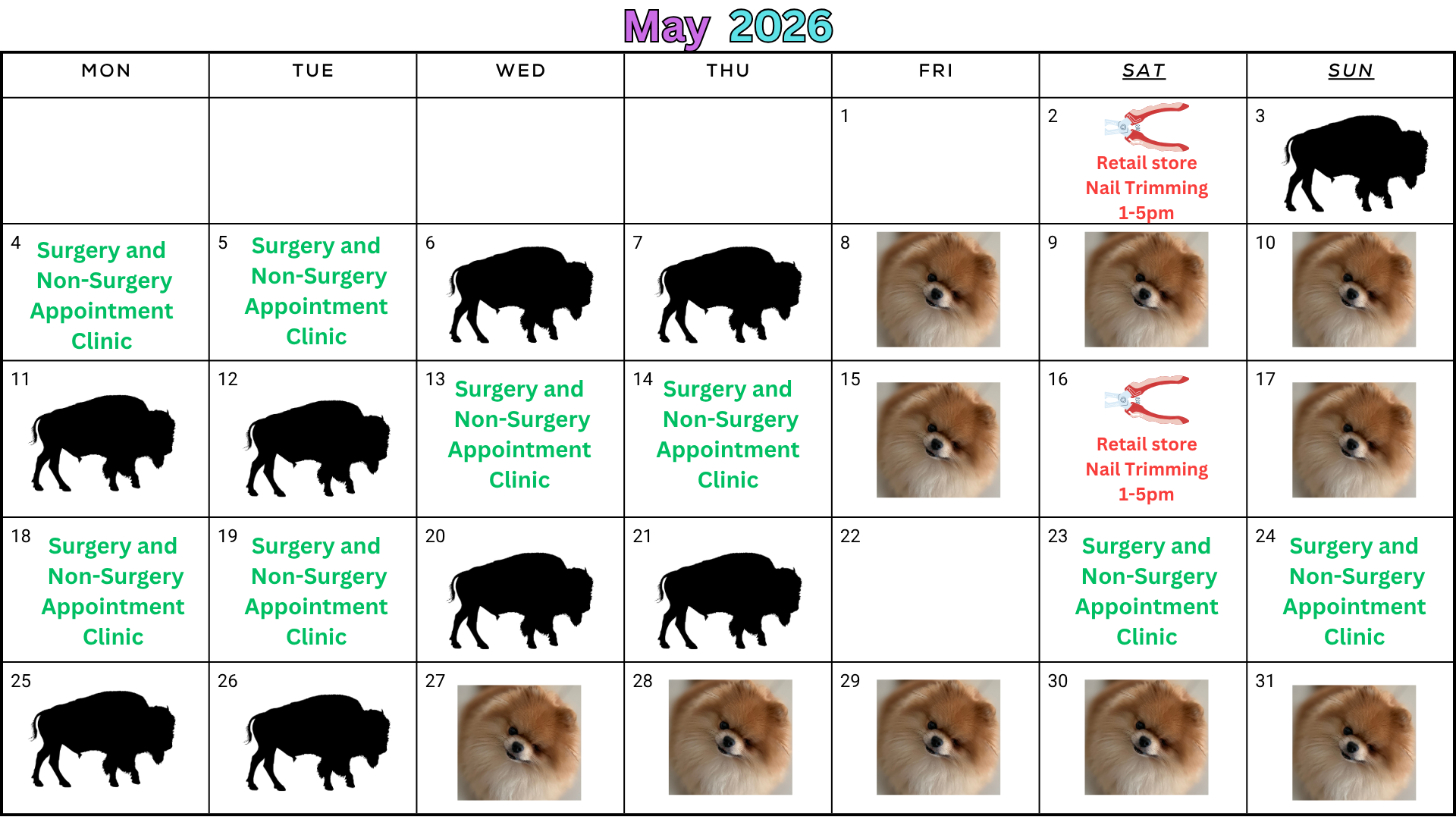 *We are a by appointment-only clinic unless a walk-in day is specified on the calendar above. Please call from 9 – 10 am on open days to check for day-of-appointment openings due to cancellations.