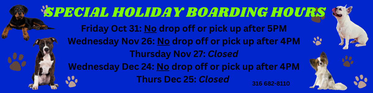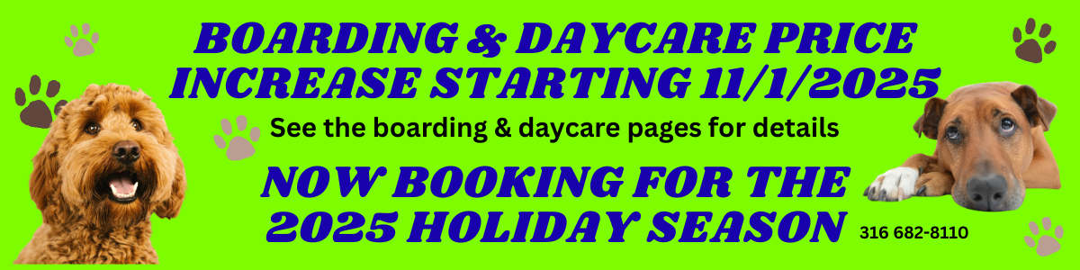 Wichita, KS 67210Our boarding (overnight stay) and daycare (no overnight stay) was established in 2005. Daycare is limited to dogs, however overnight boarding is offered for dogs, cats, rabbits, guinea pigs, ferrets, birds, lizards, and possibly other animals--you just need to ask. Cats & other small animals are housed in a special section of the retail building Check out the details in the boarding and daycare section.