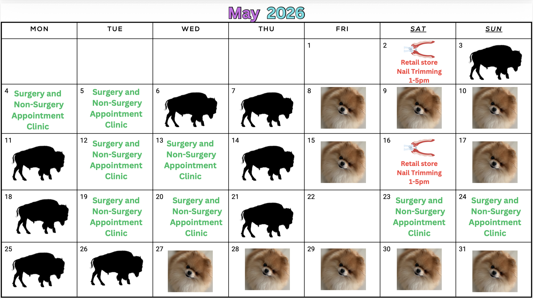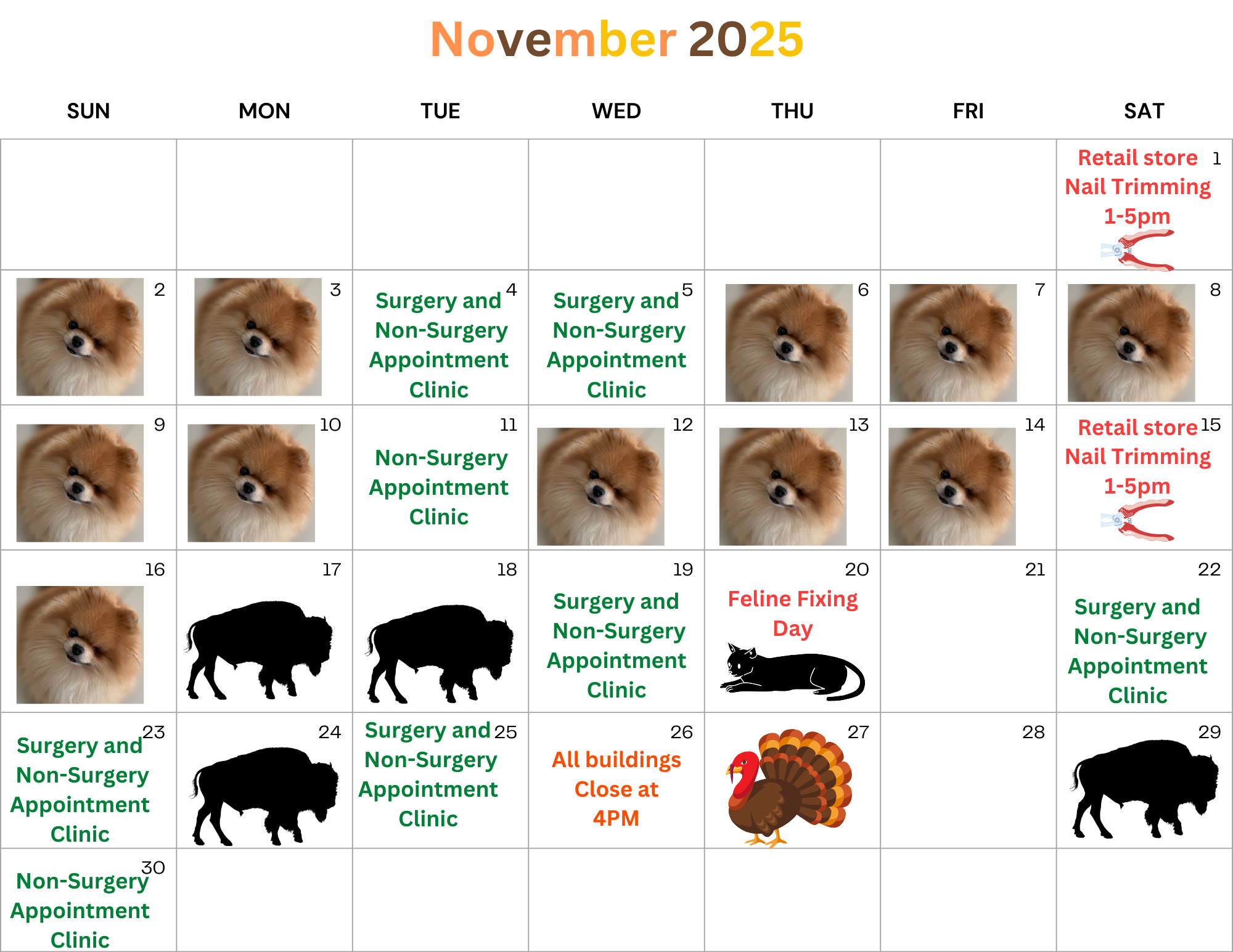 *We are a by appointment-only clinic unless a walk-in day is specified on the calendar above. Please call from 9 – 10 am on open days to check for day-of-appointment openings due to cancellations.